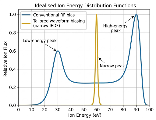 TWB addresses a long-standing compromise in plasma processing. Engineers want ions to reach the wafer with the right amount of energy – not too little and not too much. Conventional approaches struggle to achieve this balance. A direct current bias can produce ions with a narrow energy peak, but it leads to surface charging that eventually shields the wafer from the plasma. Standard sinusoidal RF biasing avoids this charging, but produces ions with a wide spread of energies.